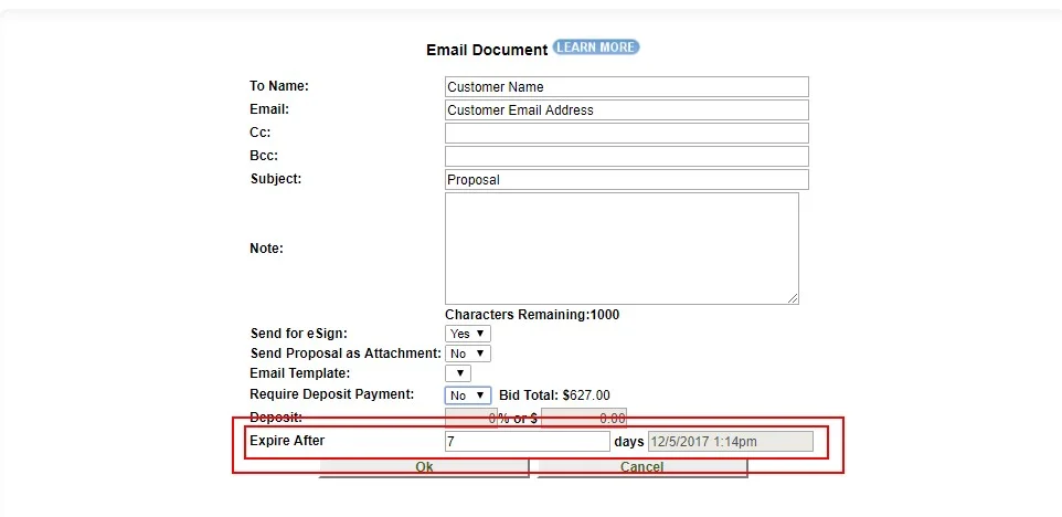 A new function for eSign emails has been added. JobPro now gives the user the option to have a link to the proposal expire after a certain number of days.