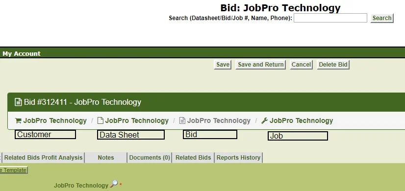 The “breadcrumbs” that exist in the top left-hand of the job are being extended to show on all data sheets and bids, as well. This way, there is a link to all aspects of the job so that a user can quickly navigate from job back to the data sheet and from the data sheet to the job.