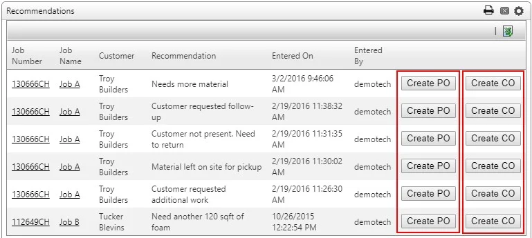Enhancements to the Job Recommendation widget are being added to the system in this release. Enhancements to the widget will include the addition of the job name, number, technician notes, the date the recommendation was entered, and the user that entered the recommendation. The widget will also include two buttons: one button for creating an “empty” change order and one button to create an “empty” purchase order.