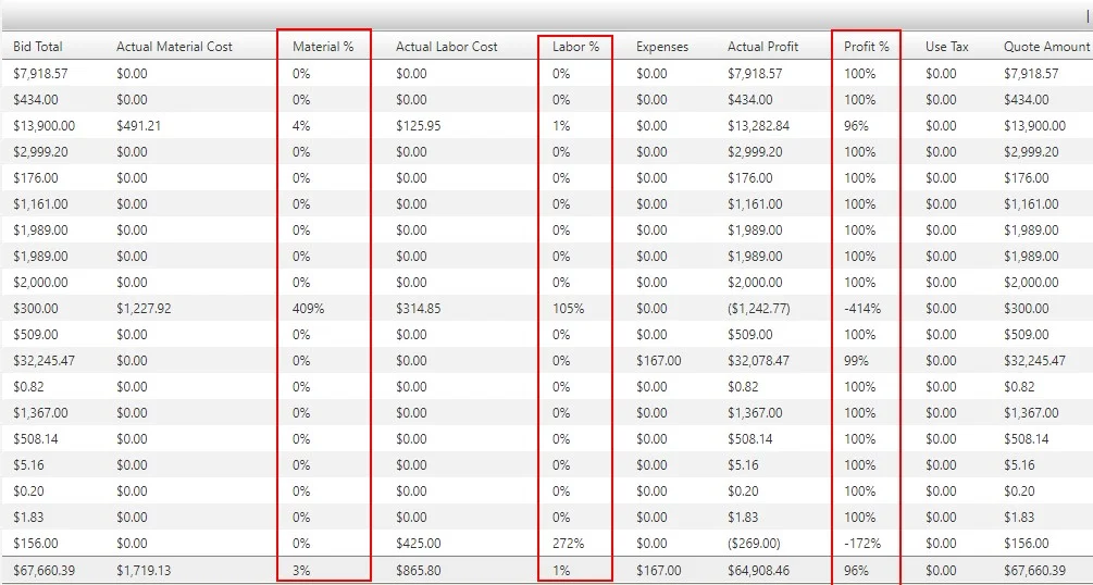 The Gross Profit Report (located by going to Reports > Summary Reports > Gross Profit Report) is being updated to include percentage values located next to the following columns: Actual Material Cost, Actual Labor Cost, and Actual Profit. These percentage values will show what percentage the selected column is of the Bid Total/Quote Amount. Percentage values are being added to give a better overall display of the appropriation of money for each job.