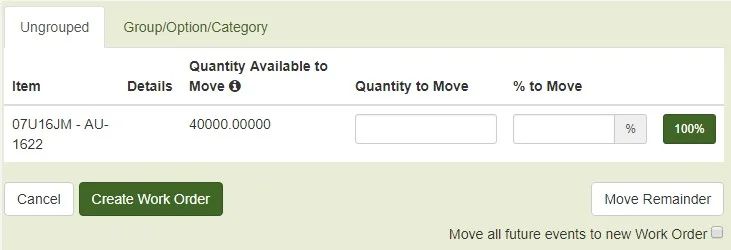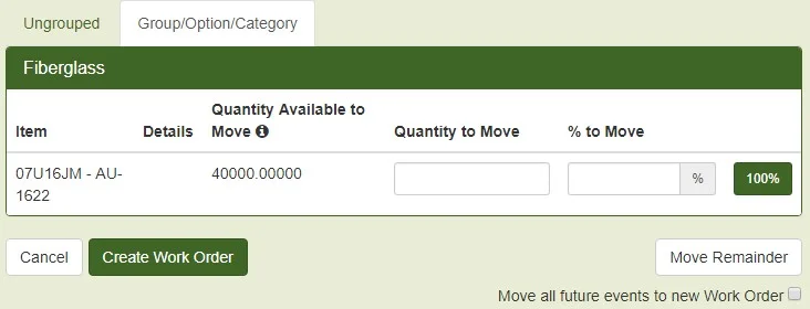The Create Work Order and Move Items pop-up windows will now include the choice to group items as they are grouped on the Bid Worksheet (Groups, Options, and Categories). This will be a toggle option for users to choose.