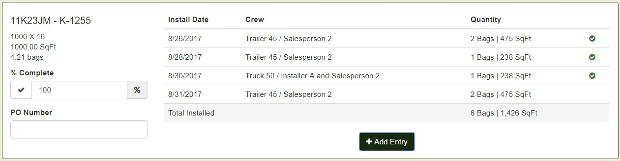 From the screen shot above, you’ll notice three distinct, green checkmarks beside three of the four installed material entries (the very bottom section is a total of all installed material). The green checkmarks signify that the installed material on that specific date has been included in a signoff. The fourth entry, without the green checkmark, has not been included in a signoff yet.