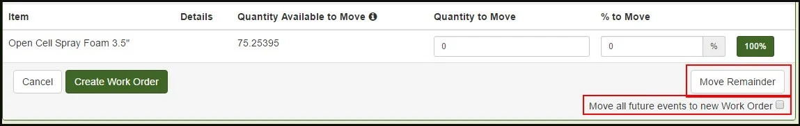 The current Move Items button is being enhanced to give the option to move an item’s remaining available quantity from the item’s current work order to either an existing or new work order. The system will determine the item’s remaining quantity by subtracting the completion percentage inputted for that item in the Job Processing tab (screen shot below) from the estimated quantity. This new feature will also allow for the transfer of future calendar events to the selected work order. The transfer of future calendar events will copy over the crew and scheduled events to the selected work order and remove those future events from the original work order. All items that are not being moved from the original work order will be updated to 100% completion.